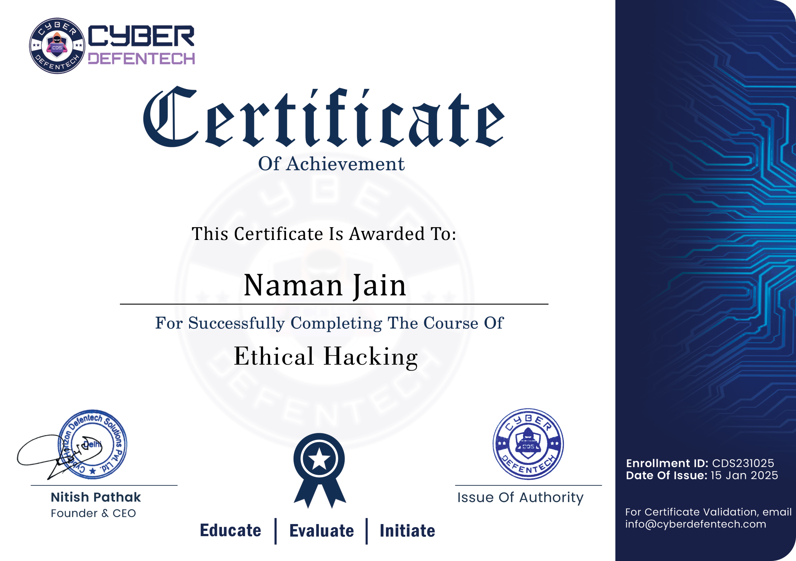 It focuses on building a deep understanding of areas such as network security, web application vulnerabilities, password attacks, malware analysis, penetration testing, and ethical hacking tools (like Metasploit, Nmap, Burp Suite, Wireshark, etc.). Learners are also taught about cybersecurity laws, ethical responsibilities, and how to report and fix discovered issues professionally.